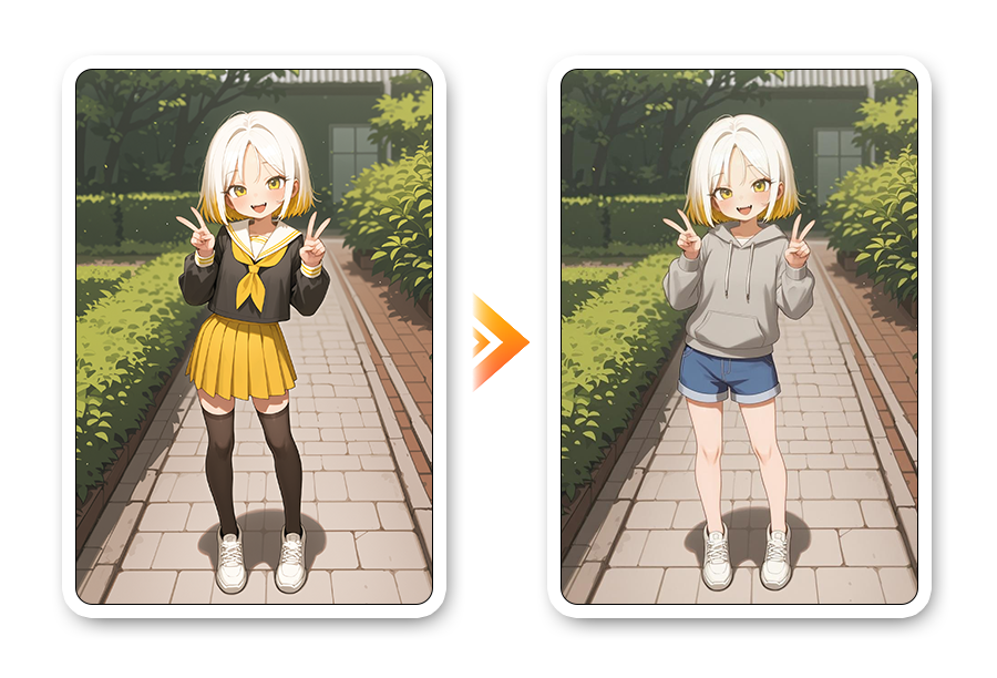 Change Outfit은 업로드한 캐릭터 이미지에서 의상만을 변경할 수 있는 AI 기반 편집 기능입니다. 캐릭터의 얼굴, 자세, 헤어스타일 등은 그대로 유지한 채, 새로운 의상을 입힌 이미지를 생성합니다.