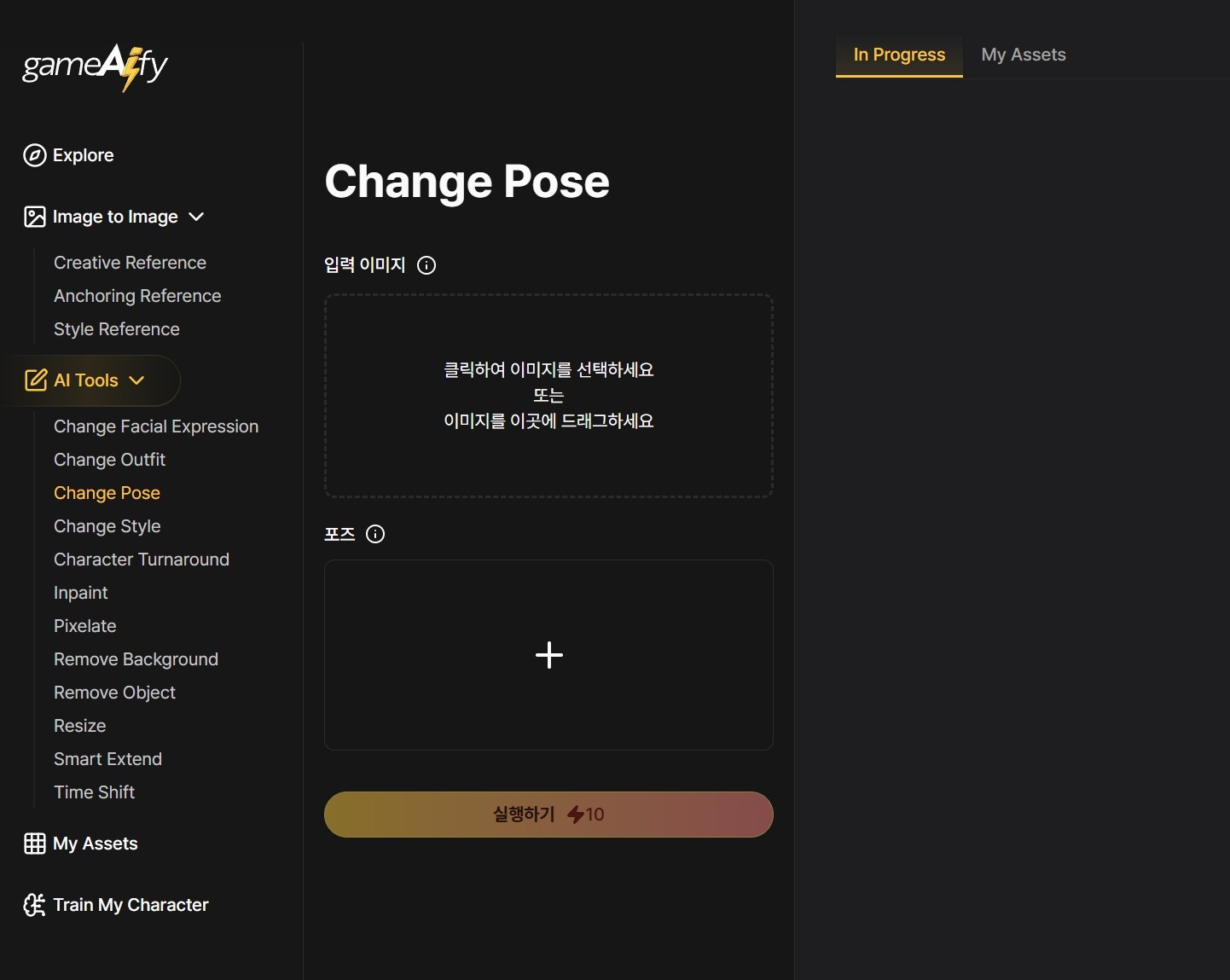 Change Pose는 업로드한 캐릭터 이미지에서 원하는 포즈로 자세를 변경해주는 AI 도구입니다.
