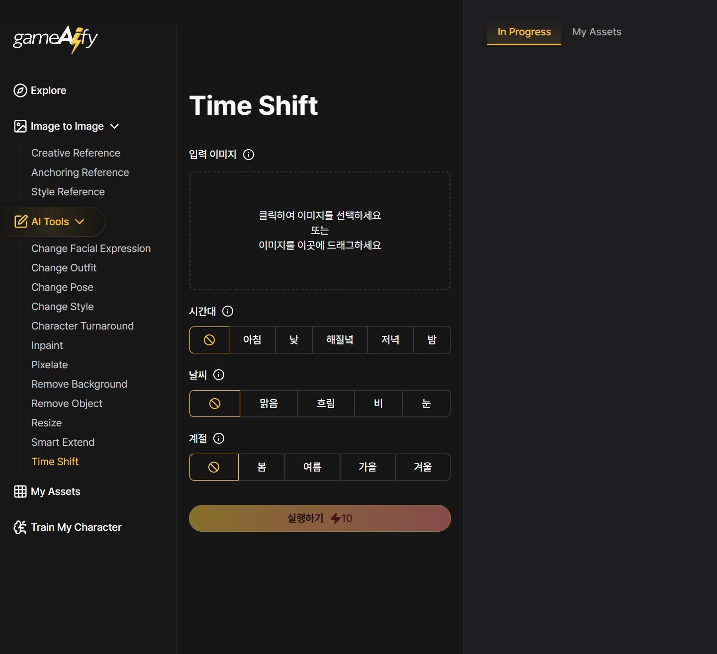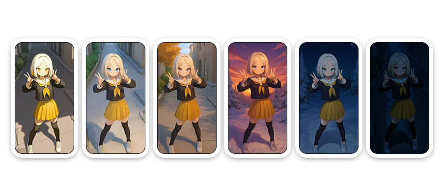 Time Shift AI Tool은 배경 이미지 하나만 있으면, 다음과 같은 환경 요소를 AI가 자동으로 바꿔주는 기능입니다: